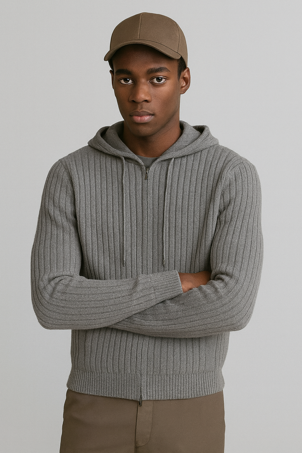 Indulge in the unmatched softness of pure cashmere with this elegant ribbed hoodie. Designed for those who value refined comfort, it’s perfect for relaxed moments, travel, or sophisticated layering. With a deep, adjustable hood and sleek full-zip front, it blends practicality with effortless style.